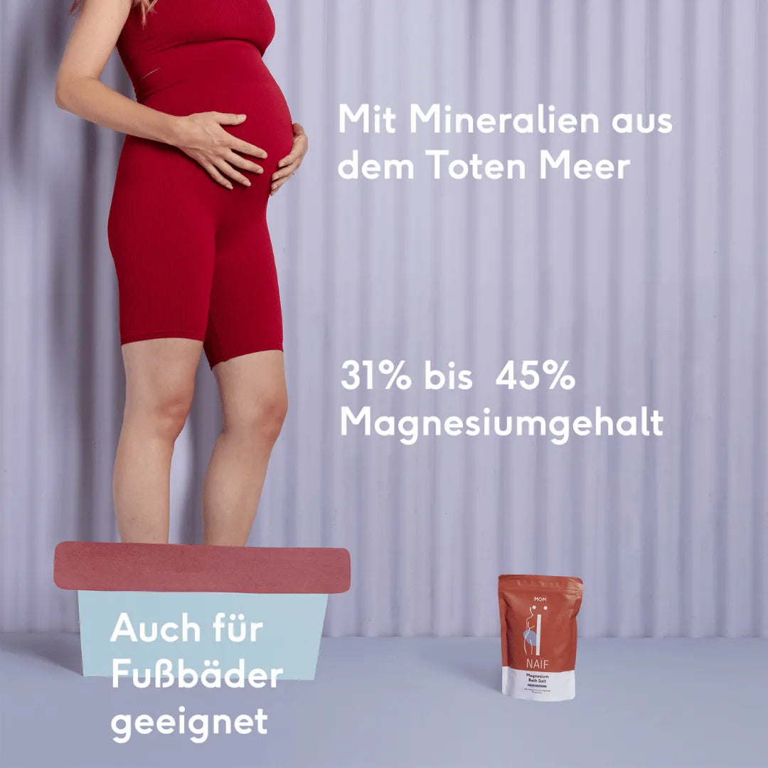 Naif Magnesium Badesalz entspannt deine Muskeln und lindert Schmerzen und Krämpfe, dank der beruhigenden Wirkung von Magnesium. Während der Schwangerschaft wird empfohlen maximal 15 Minuten zu baden. Steige dann langsam aus der Badewanne und spüle dich gut ab.